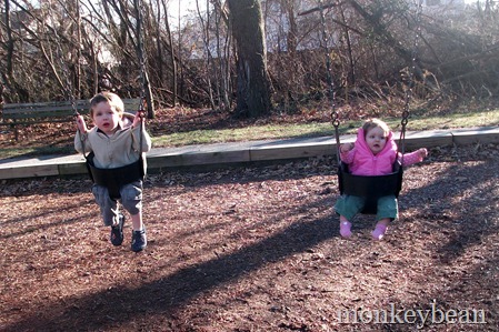 The kids woke up early from naps yesterday, and since the weather was nice, we drove to a local park. Kennedy loves swinging on the swings now, and I was excited to put her in a nice baby swing instead of the somewhat ghetto one we have at our community playground! She had an absolute ball. Bennet wanted to swing with her, but as soon as I put him in the swing he claimed “this not fun” and wanted out!